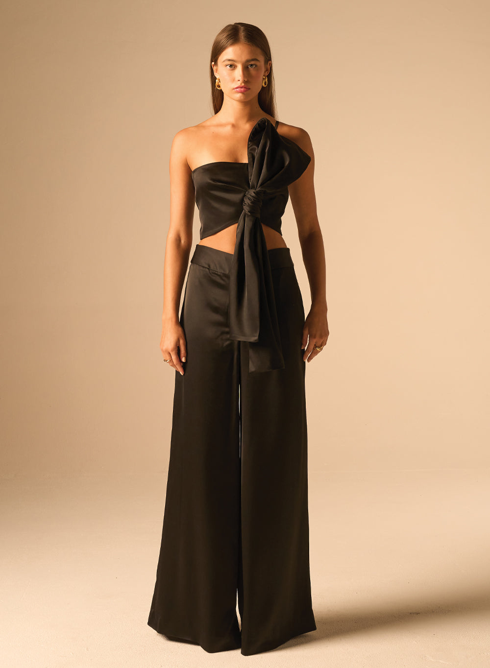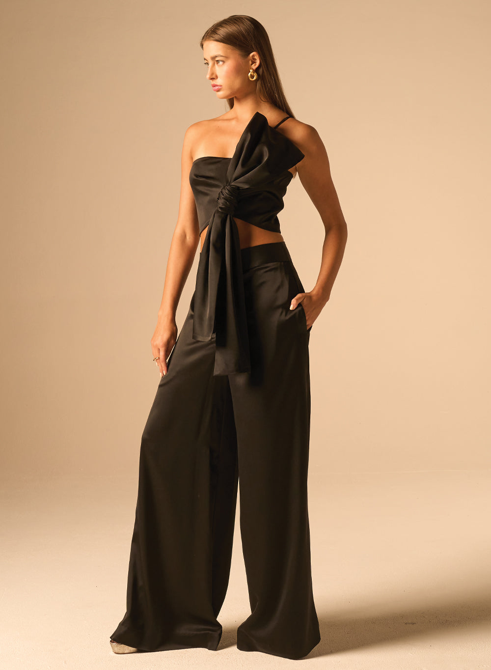 - Asymmetrical halter neckline with a modern, sculptural twist detail