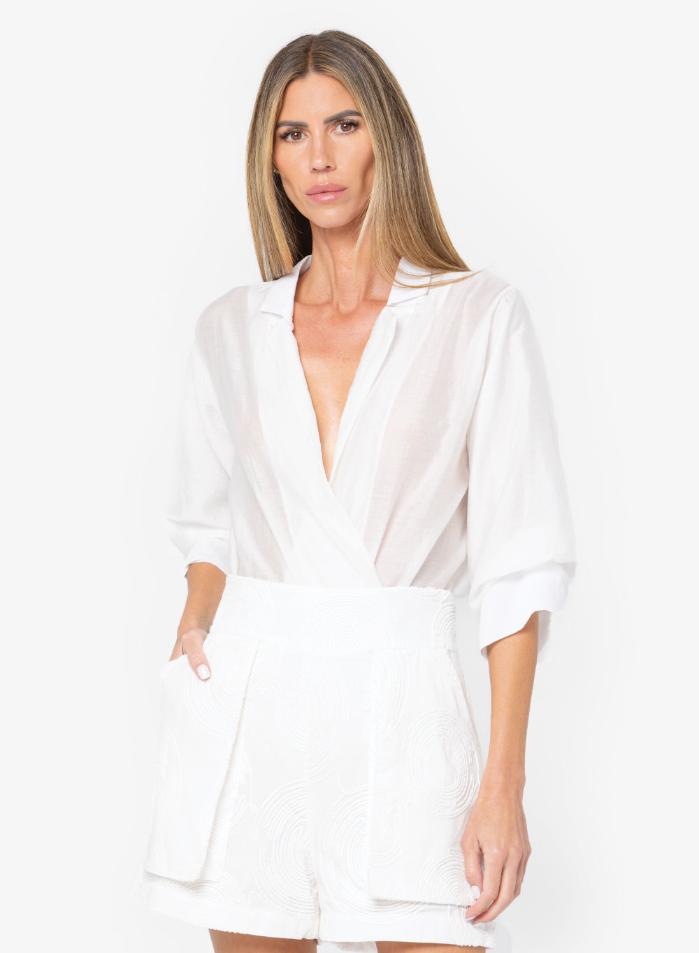 - Deep V-neckline with front button closure