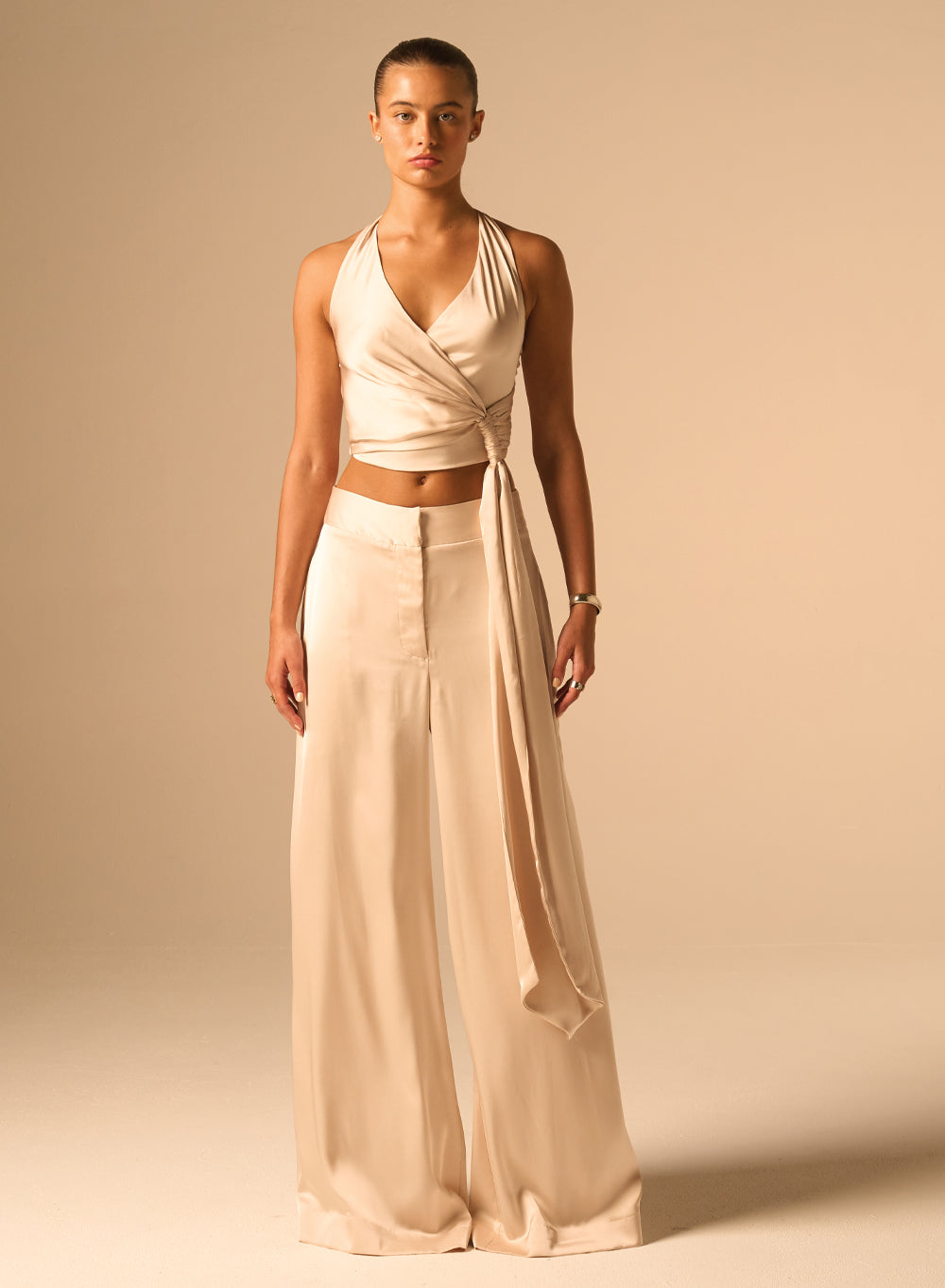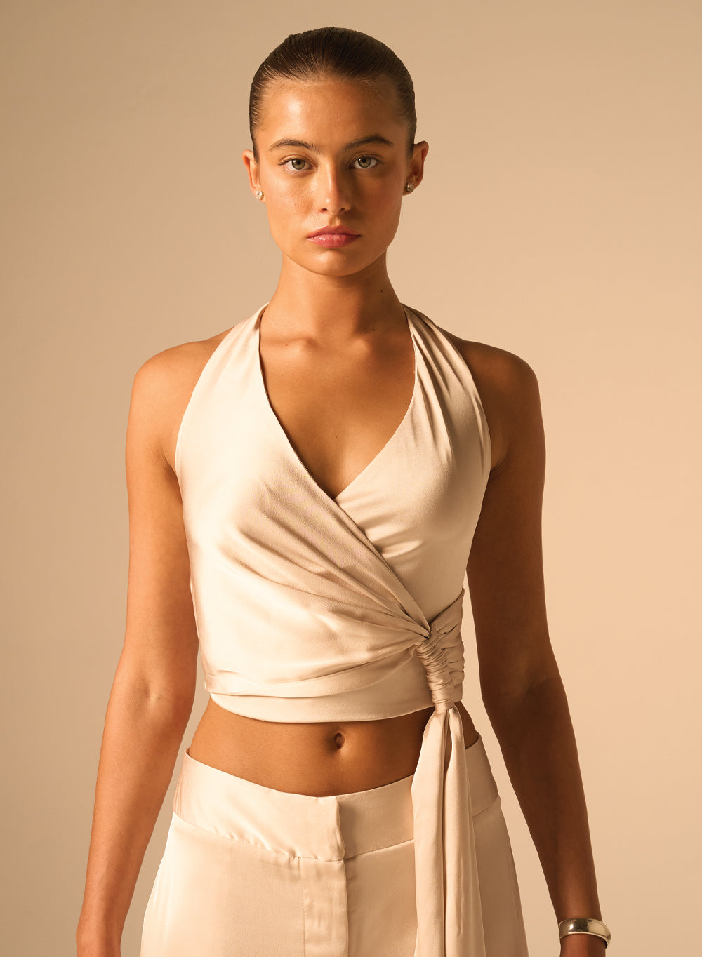 - Crossover halter neckline with wrap effect at the front